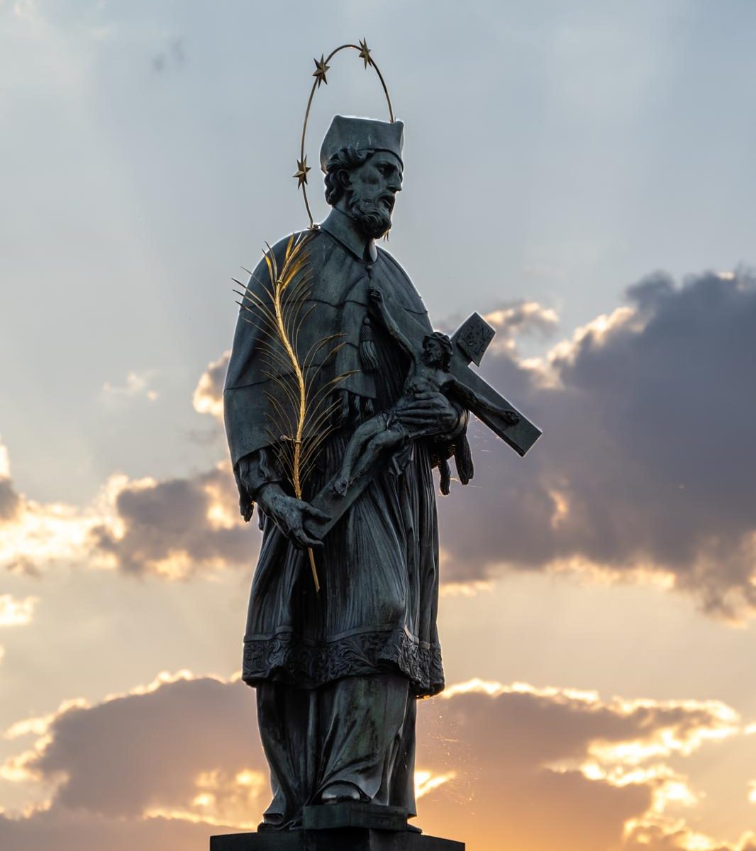 Die beiden Fotos stammen aus Prag und wurden von meiner Freundin Britta Wilke aufgenommen. Sie zeigen die Statue des Nepomuk auf der Karlsbrücke über die Moldau. Die Lichtverhältnisse an diesem Frühlingstag im Jahr 2025 waren ein wahrer Glücksfall für die Fotografin.