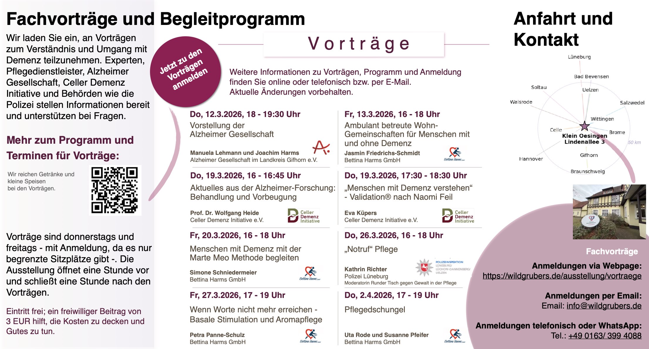 Fachvorträge und Informationen zum Umgang mit Demenz verschiedener Institutionen wie Pflegedienstleister, Polizei, Alzheimer Gesellschaft und umfangreiches Rahmenprogramm.