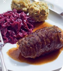Roulade ist eine Rinderroulade (mit der Betonung auf „la“). Es ist eine dünne Rindfleischrolle, gefüllt mit Zwiebeln, Speck, Senf, Gemüse und anderen Zutaten. Sie wird gegrillt, in der Pfanne gebraten und schließlich gekocht und mit Kartoffeln und Rotkohl serviert. Es ist ein französisches Gericht. Das Wort kommt vom französischen „rouller“, was „aufgerollt wie ein Fahrradrad“ bedeutet. Die Kohlrouladen, die ich gerne zu Hause mache, ähneln diesem Gericht. Auch der in Weinblättern gerollte Reis mit Fleisch, den ich in Ägypten und muslimischen Ländern gegessen habe, ist ähnlich. Manche Leute sind faul und bereiten große Rouladen zu, aber die kleinen sind exquisit und geschmackvoller.